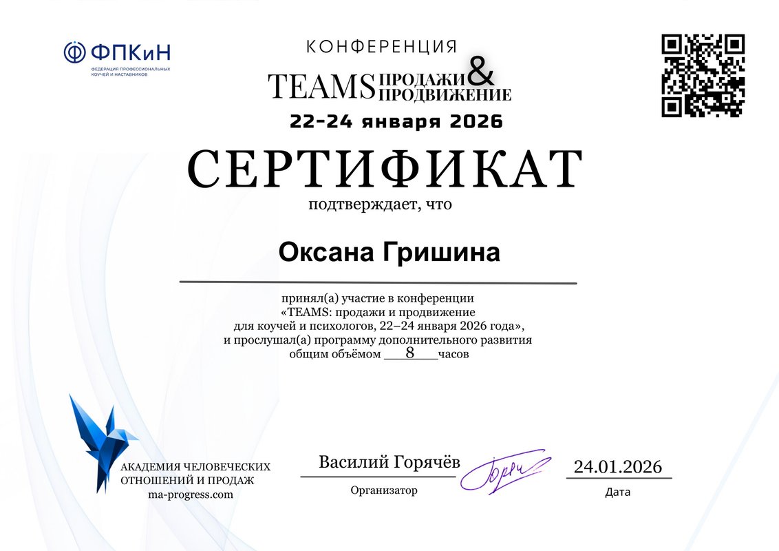 Здравствуйте! Я Гришина Оксана, Ваш личный и семейный психолог, ведущая групп и тренингов, наставник начинающих психологов