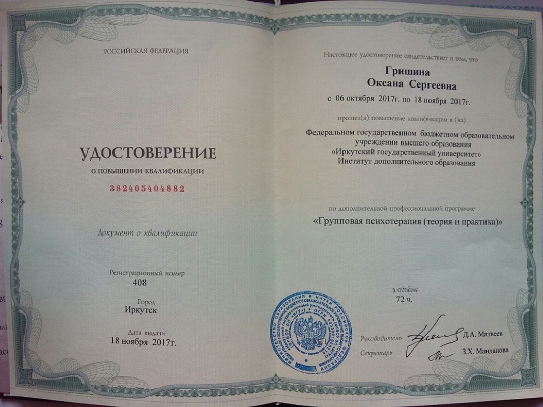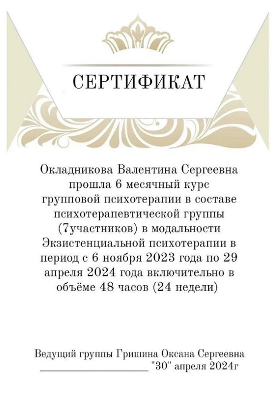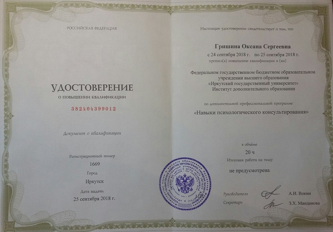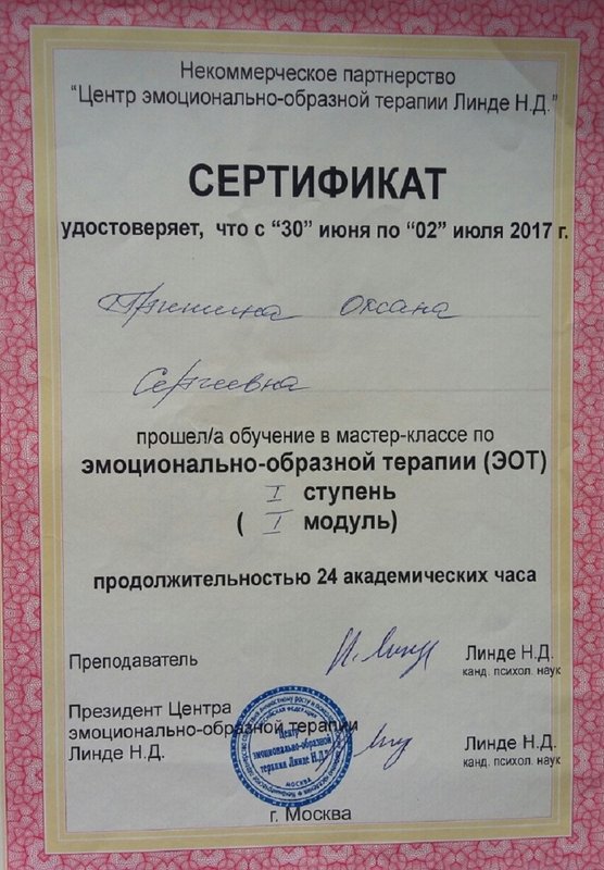 Дополнительное обучение - по 2 курса в год повышения квалификации, сейчас обучаюсь в ИПМП им. Б.Д.Карвасарского г.Санкт-Петербурге на "Клинического психолога".